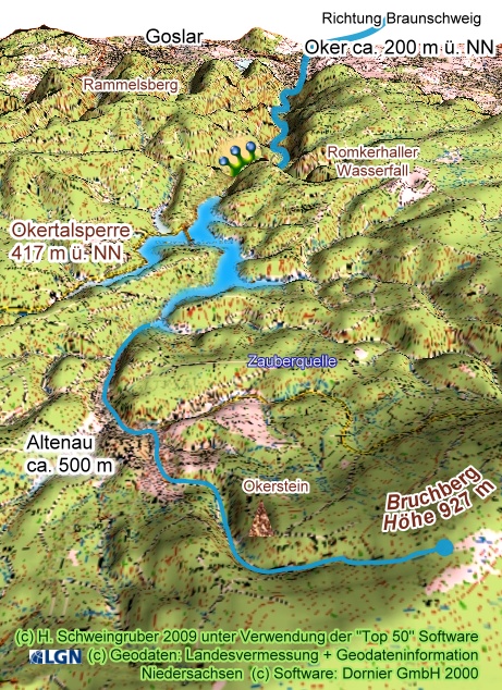 Aus etwa 900 m Höhe über dem Meeresspiegel stürzt sich die Oker vom Bruchberg ins Tal und gurgelt nach Altenau hinunter. Der Bruchberg liegt westlich vom Brocken und ist ein hervorragendes Regengebiet - also Wetterkleidung mitnehmen!