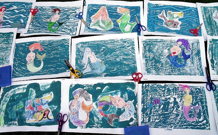 Es gab genug Ideen für eigene Geschichten. Auf selbstgedrucktem “Wasser” konnte die Hauptfigur der eigenen Geschichte ausgemalt werden.